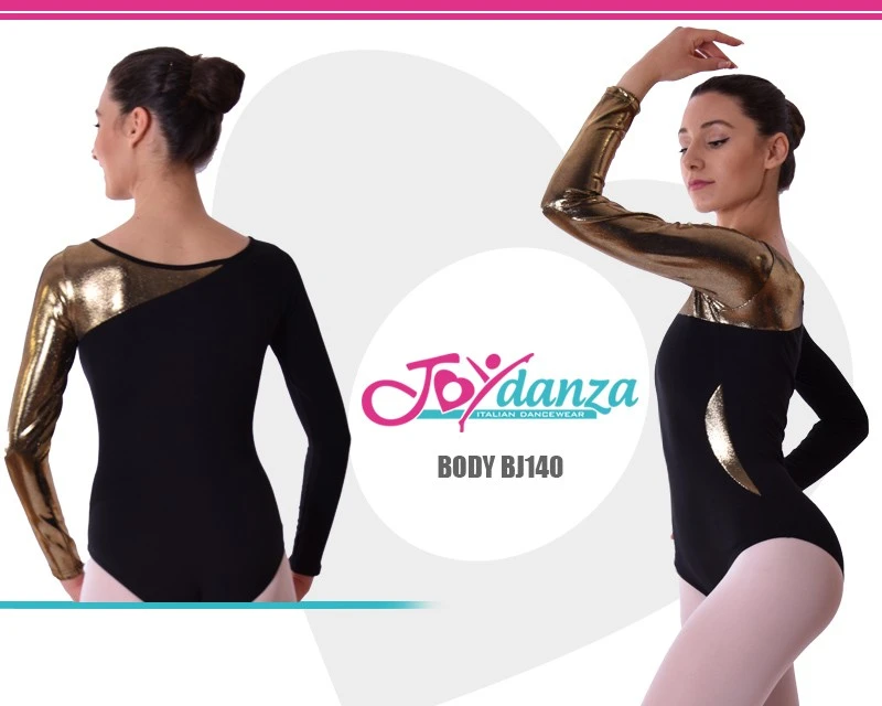 Quasi tutto in lycra tinta unita, il body danza asimmetrico lascia spazio al laminato soltanto per un braccio ed uno spicchio sul fianco. Asimmetria dal grande impatto scenico. In foto realizzato in Lycra nero e Brillante Nero Oro.