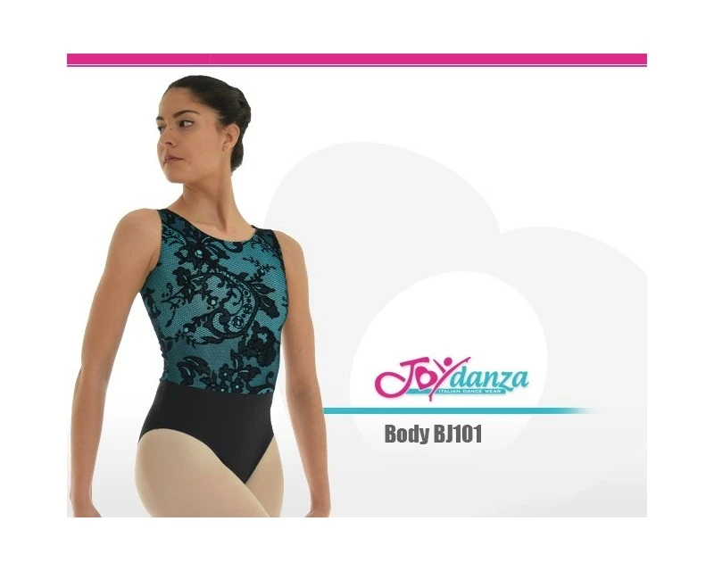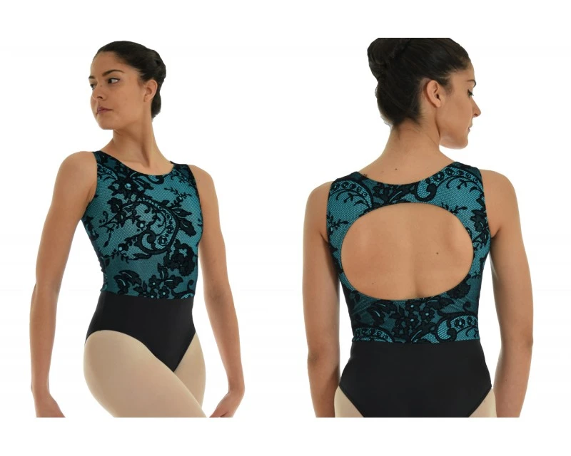 Un body danza per esibizione, ben accollato, a canottiera dalla fascia larga, con uno foro rotondo ambio sulla schiena a fornire un carattere moderno e contemporaneo a seconda del colore scelto.. Tinta unita al bacino, in tessuto floccato tutto il resto de body.