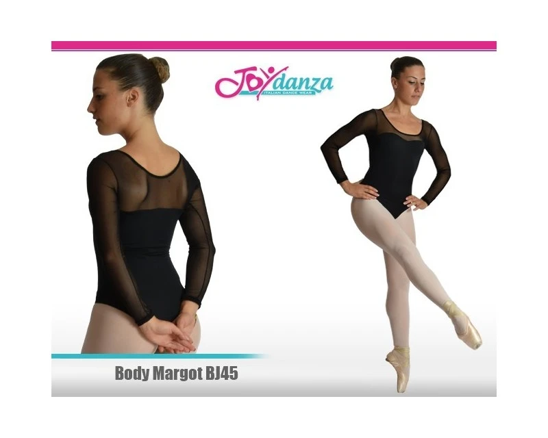 Body manica lunga per la danza classica e danza moderna, confezionato con un bustino di lycra coprente e scollatura con maniche in rete elastica trasparente.