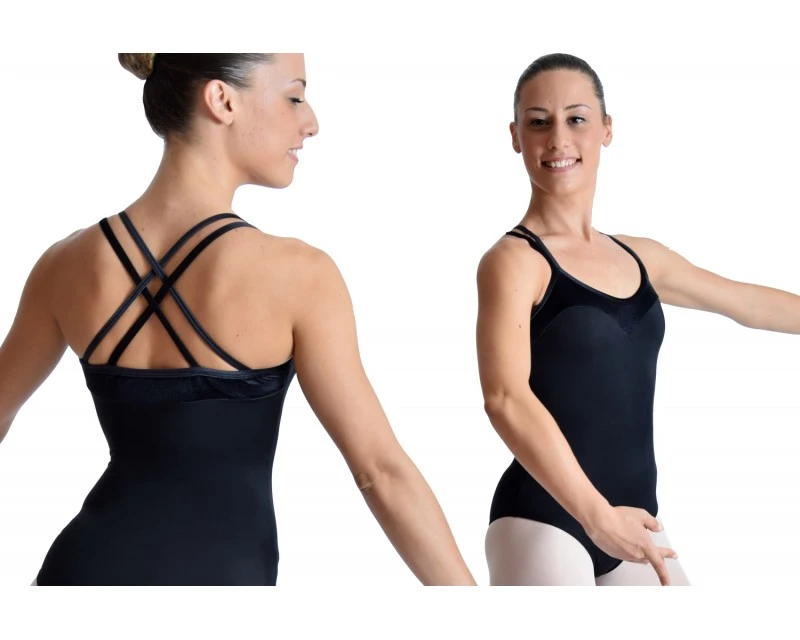 Body danza in velluto e lycra con bretelline incrociate. Elegante e allo stesso tempo contenuto nel prezzo può essere realizzato tono su tono oppure bicolore per avere un effetto più dinamico.