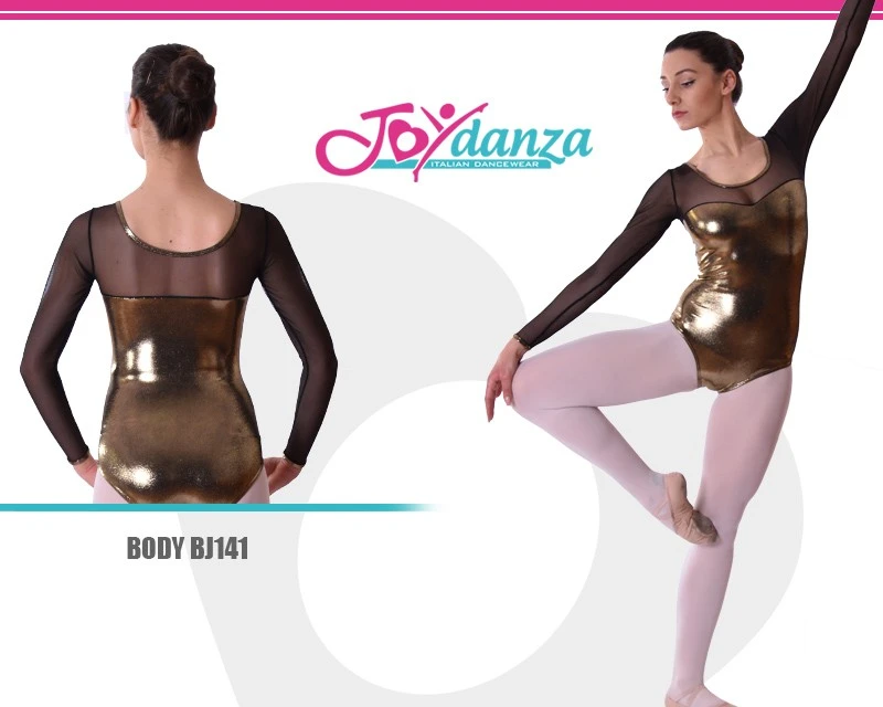 Body con corpetto in rete elastica e tessuto laminato brillante o super brillante a scelta. Parte superiore sopra seno, spalle e braccia a manica lunga in rete elastica. Le combinazioni colori lo rendono adatto a molteplici spettacoli danza moderna e contemporanea.