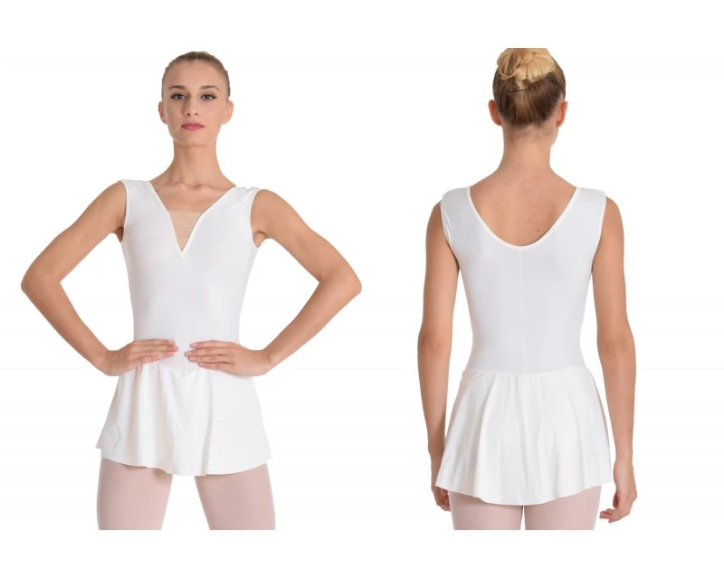 Il Body Danza. Cosi ci piacerebbere denominare questo modello dal disegno apparentemente semplice, dove tutto è stato studiato nei minimi particolari per renderlo adatto a tutte le età, dalla bambina di 3-4 anni alla donna adulta. Grazioso per le piu piccole, femminile per le più grandi, inserto a puntalino in rete nudo per un pregevole effetto estetico senza pronunciare troppo la scollatura. Senza manica ma con passante largo sulle spalle a fornire stabilità con impercettibile tocco glamour. La gonna ha la cucitura in vita leggermente “impuntata” e attaccata a vita leggermente più bassa. Anche il taglio della gonna viene leggermente stondato. Tutto per slanciare la figura. Il gonnellino è sicuramente la scelta ideale per le divise di danza classica ma questo modello si presta anche ad altri contesti, come spettacoli danza moderna e neoclassica.