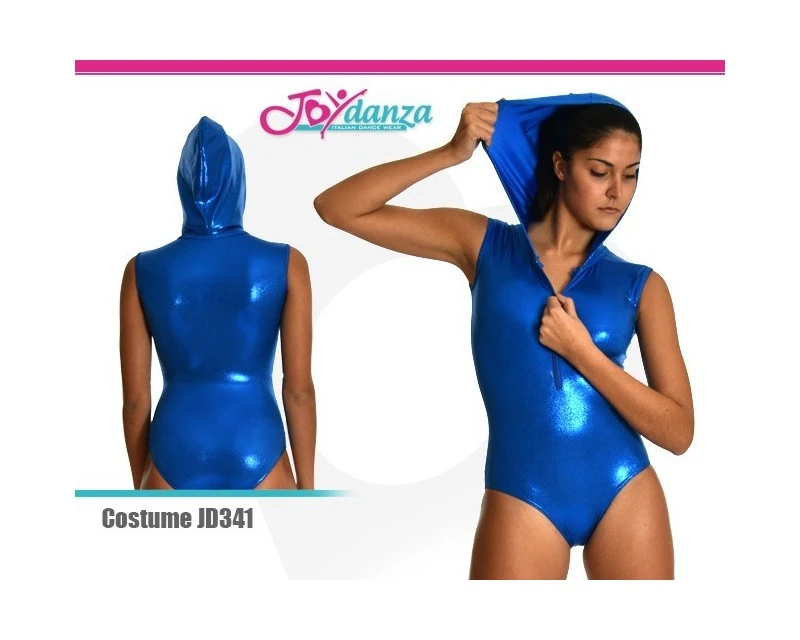 Body con cappuccio per spettacoli di danza, interamente in tessuto laminato garantisce un effetto brioso sotto i riflettori. Realizzabile in ben 26 colori.