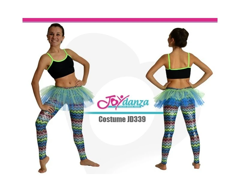 Costume per la danza moderna composto da top e leggings con due strati di tulle rigido a colori alternati impunturati in vita. Colori e fantasia vivaci per un completo adatto a varie discipline.