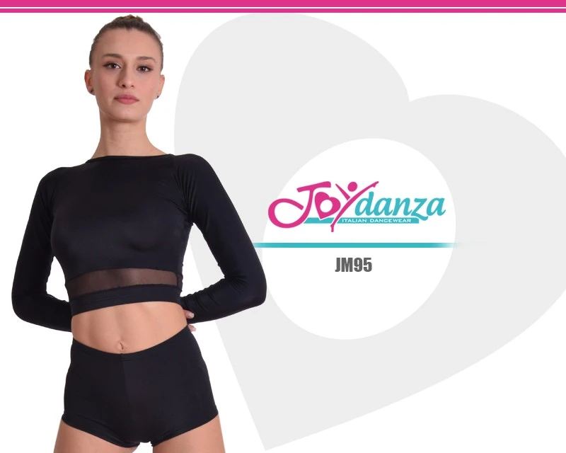 Completo top e pantaloncino coulotte per danza moderna e contemporanea, composto dal top a manica lunga con inserto in rete e chiusura con zip. Nella foto la ballerina lo indossa con a zip dietro. Si presta anche a contesti street dance semplicemente indossando il top al contario con zip davanti.