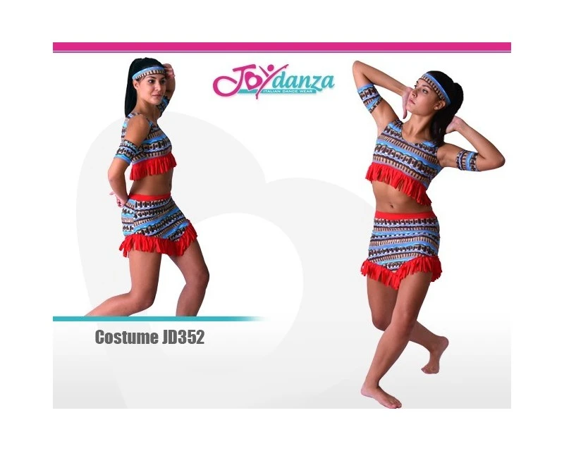 Un completo di top e gonna con frange, corredato da 2 bracciali ed una fascia per capelli della stessa fantasia. Il modello è stato ideato per rappresentare gli indiani d’America. Scegliendo un tessuto diverso può cambiare caratter e contesto, finanche a togliere le frange per metter in scena tantissimi spettacoli danza moderna.