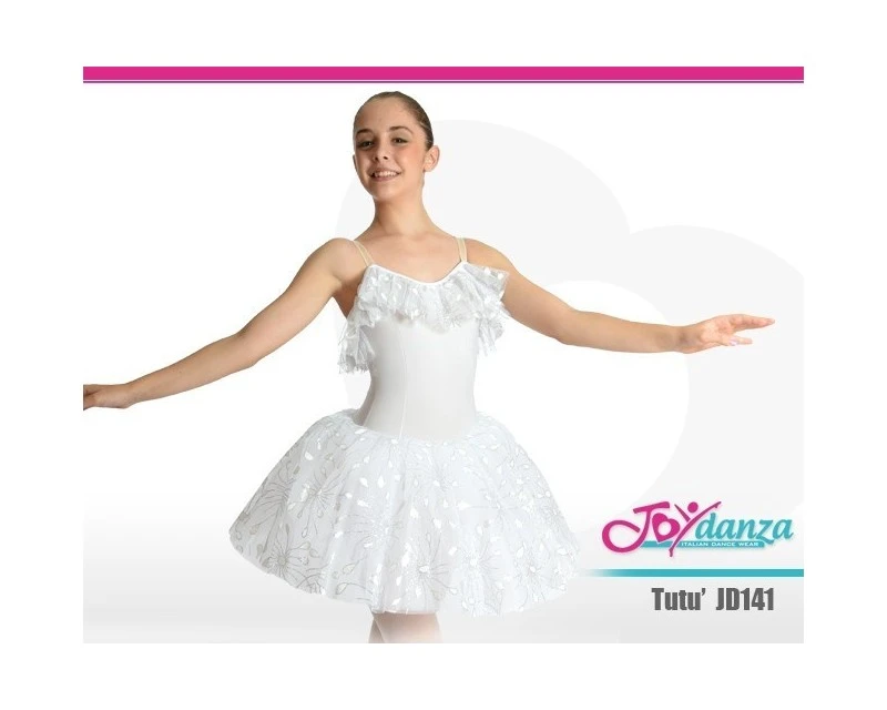 Tutù Degas corto a campana con delicate decorazioni sul primo strato di tulle e sulla rouches del corpetto. Ideale per molti balletti tra cui la Giselle. Le decorazioni del tulle e della rouche possono variare nel disegno e nei colori, si suggerisce contattare il nostro staff per maggiori dettagli. La rouches può essere personalizzata nella lunghezza.