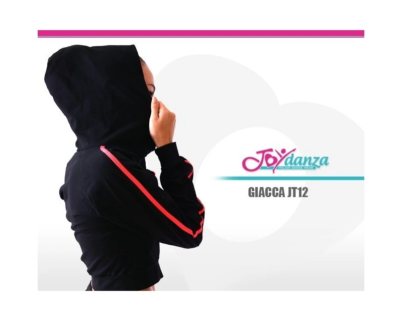 Giacca da tuta per spettacolo con inserto sulle maniche in contrasto, abbinato all’interno del cappuccio. Realizzata in cotone “maglina”. Il modello è stato disegnato pensando a spettacoli tipici della street dance, hip hop e danza moderna.