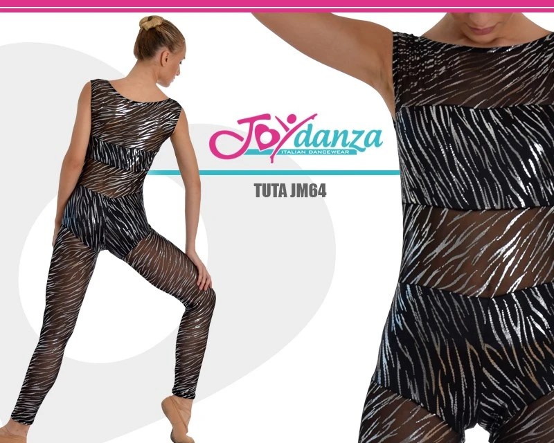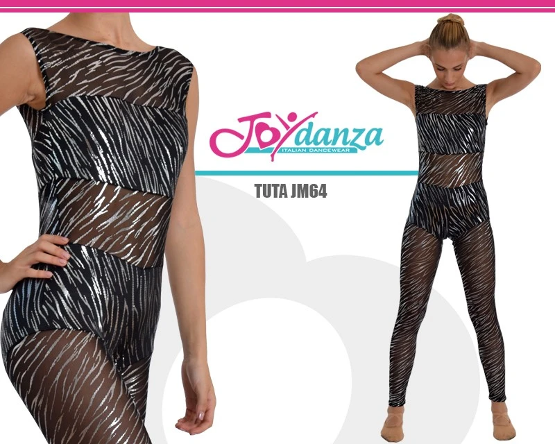 Tuta danza aderente da spettacolo in un’accoppiata tessuti di grande impatto. La rete e la lycra con la stessa decorazione in graffiato argento la rendono un articolo danza molto apprezzata dai coreografi danza moderna e contemporanea. Il disegno prevede uno smanicato lungo fino alle caviglie, con scollo a barca in rete, interrotto si fa per dire, da top e coulotte in lycra stesso disegno. Realizzabile in tutte le taglie e in altre fantasie che permettono la continuità disegno di due tessuti diversi.