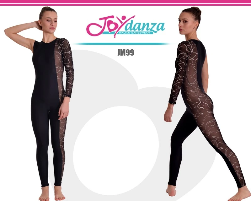 Tuta accademica per la danza divisa in verticale a tre quarti, tra lycra e microrete glitterata. Giochi di trasparenze e asimmetrie date anche dalla manica singola, perfetta per coreografie con luci basse ma dirette.