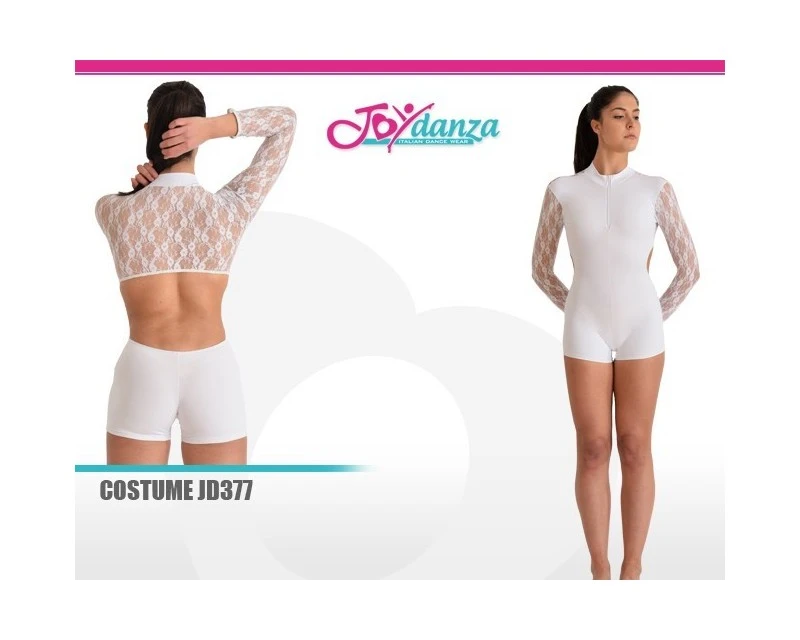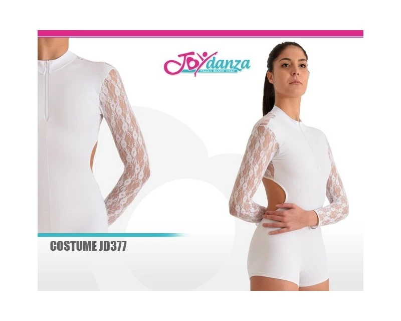 Una tuta danza contemporanea con cerniera centrale e collo alto. Le maniche sono in pizzo e personalizzabili anche in altri tessuti contattando il nostro staff. Il dorso presenta la schiena scoperta dalle scapole in giù. La sgambatura è a pantaloncino.