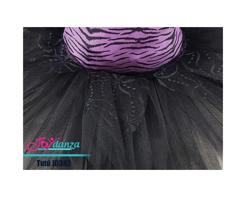 Una versione moderna e stravagante di tutù, caratterizzato da un body a manica lunga e sgambatura a pantaloncino, stoffa tigrata, piatto con taglia zig zag e un copri tutù più corto decorativo, tono su tono. Le personalizzazioni tramite i colori e i tessuti lo possono caratterizzare per tantissime coreografie di danza moderna.