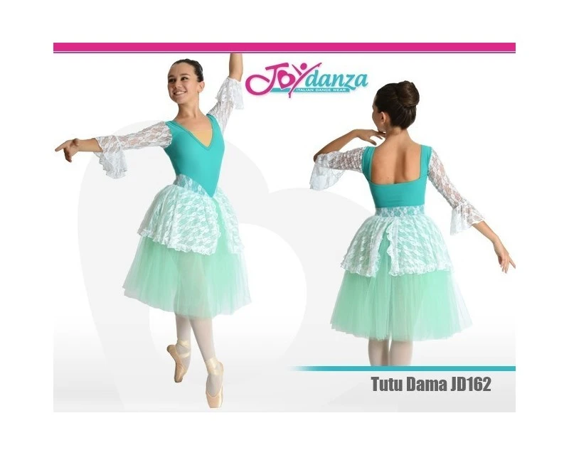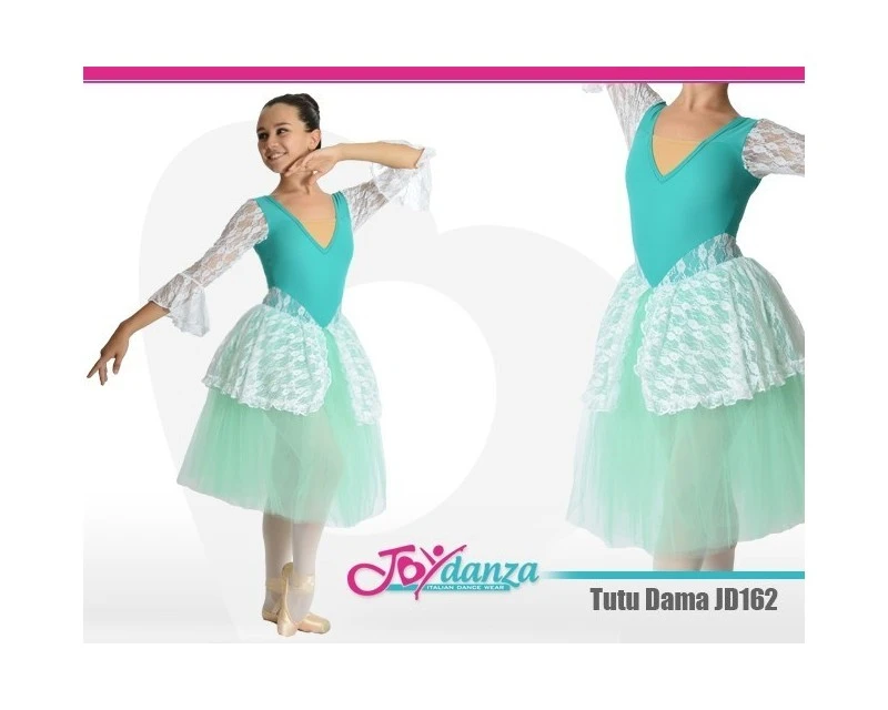 Tutù ballerina taglio degas con maniche e baschina in pizzo. Per dame, cortigiane e personaggi aristocratici, in una variante dove il pizzo è predominante. Un insolito corpetto con maniche dal finale a voilant interamente in pizzo merlettato, scollo dorsale quadro, scollatura anteriore a V con inserto elastico nudo.