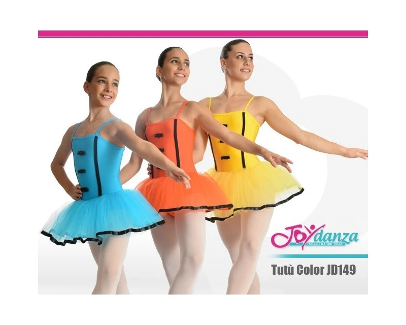 Tutù colorati per majorette e spettacoli vivaci. La struttura è a bretelline con uno scollo più quadrato del classico bretelline tondeggiante. Sei strati di tulle morbido rendono vaporosa la gonna, orlata con un nastrino in tinta con i nodini e le bordature verticali del body. Come si evince dalle foto, questo tutù è consigliato per chi vuole donare particolare vivacità al proprio balletto attraverso le colorazioni dei costumi.