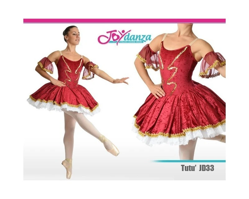 Tutù professionale in velluto con decorazioni di merletti e passamanerie dorate.
