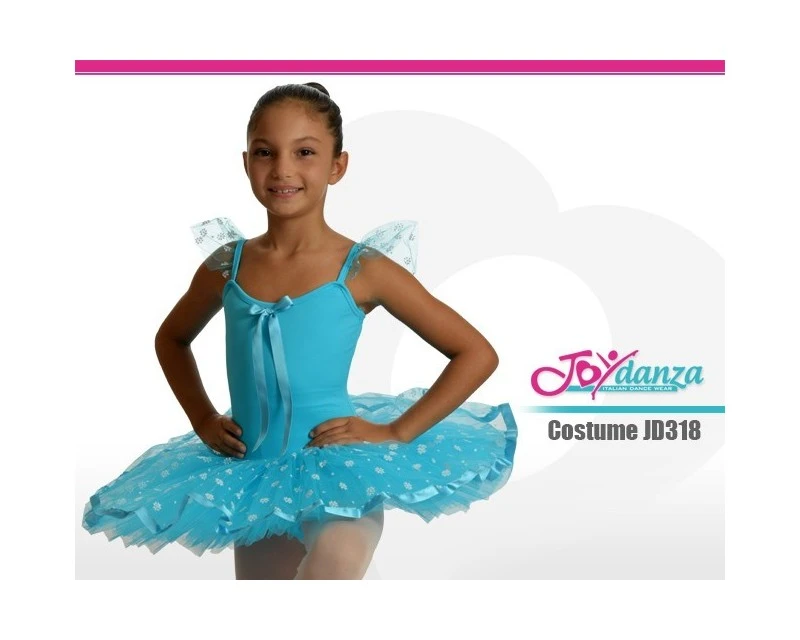 Grazioso tutù da saggio per bambina, impreziosito da alette, in tulle rigido decorato, applicate sulle bretelline. Lo stesso tulle è richiamato sul primo strato della corolla che viene rifinito da un’orlatura di raso in tinta. Rende tanto sia nei colori vivaci che in quelli tenui e delicati.