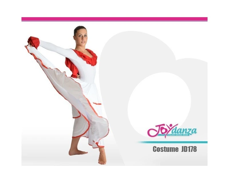 Vestito flamenco adatto anche ad altri spettacoli che strizzano l’occhio a questo ballo. Corpetto a manica lunga con voilant ai polsi dalla tipica forma con colori in contrasto. Scollo evidenziato da balza lunga tutto lo scollo rotondo e pronunciato anteriormente. A maggiore profondità sul dorso. Gonna a balze tipiche spagnole con bordature in nastri di raso, tessuto specifico o merletto, alternativa da segnalare al momento dell’ordine.